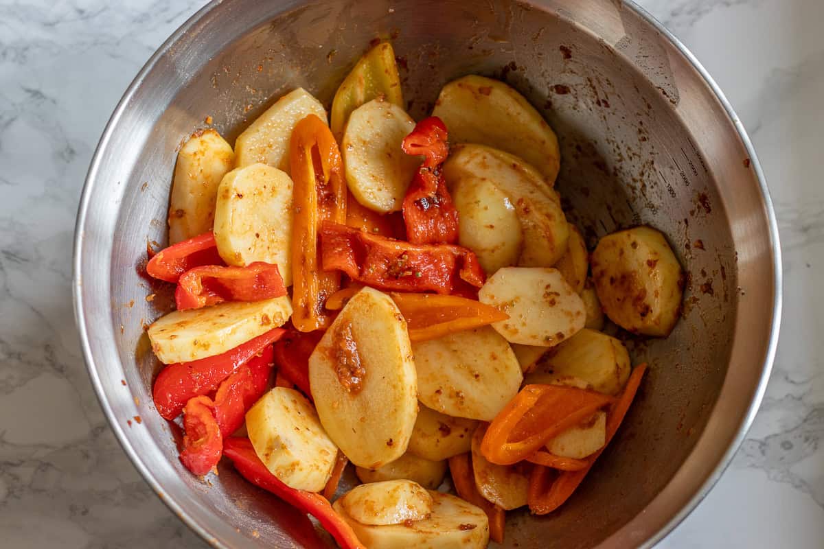 - Spread the potato wedges on the bottom of your oven dish. Layer the peppers on top of the potatoes.