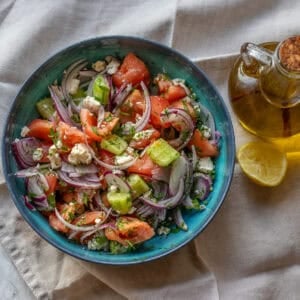 Cucumber, tomato, and feta cheese salad works well with many meals. It is a great side dish for Hamsi Tava - Crispy Fried Anchovies, or Baked Lamb Chops - Firinda Kuzu Pirzola, and it pairs nicely with Mediterranean Roasted Vegetables, or Turkish Lahmacun.