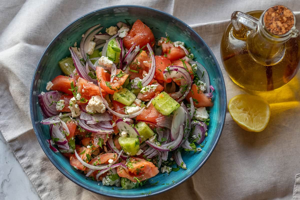 Crisp cucumbers, juicy tomatoes, and salty feta are mixed with olive oil and herbs for a clean, Mediterranean-style flavour. The salad is light, yet filling enough to serve alongside many main dishes.