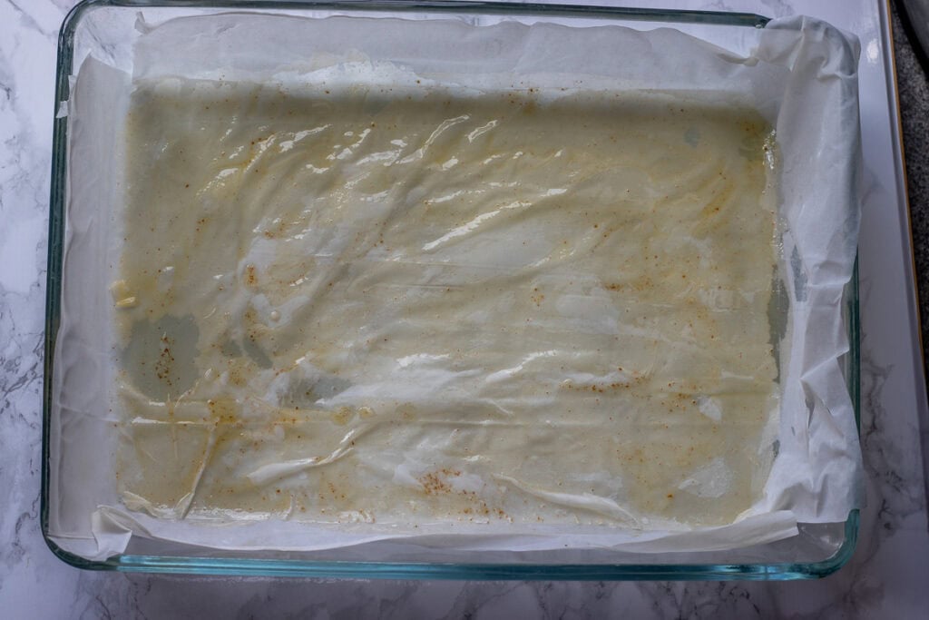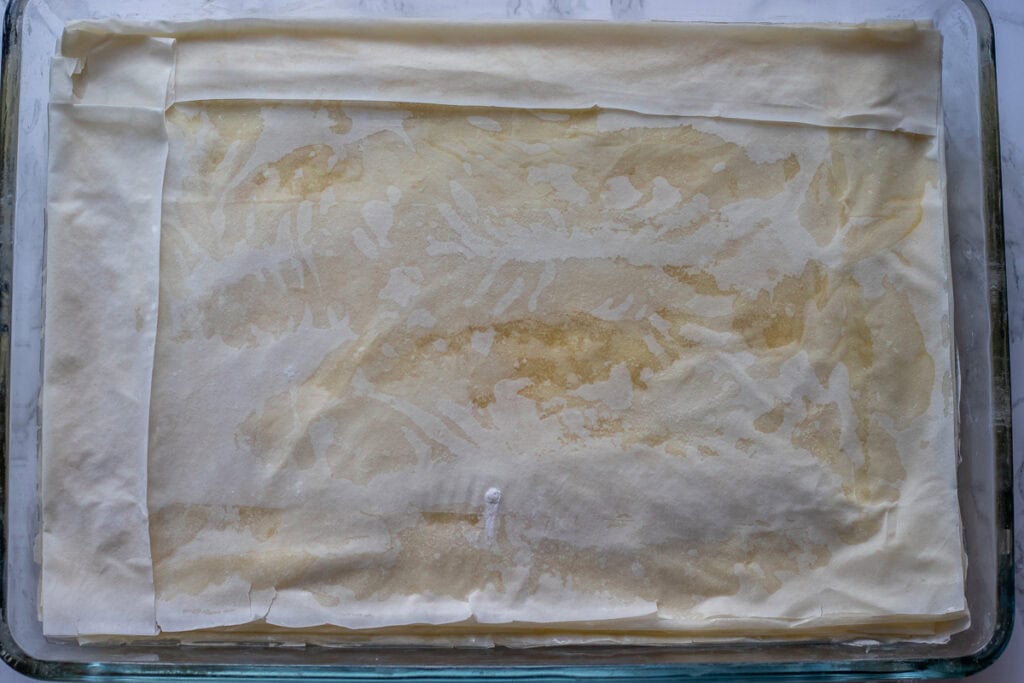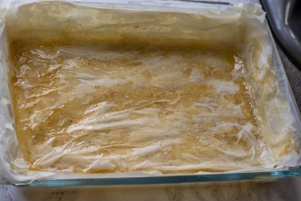 Lay a sheet of phyllo in the dish and lightly brush the top with butter. Repeat until you have used half of the pastry.