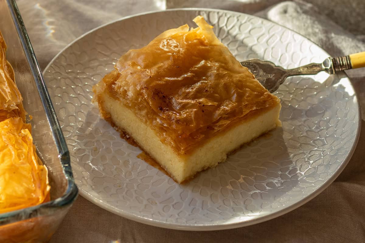 Galaktoboureko stores well, which makes it a good make-ahead dessert. You can keep it covered at room temperature for about a day if your kitchen is cool. If you want to keep it longer, you can cover it with plastic wrap and store it for up to 4 days. The pastry loses some crispness in the fridge, but the flavour holds well.