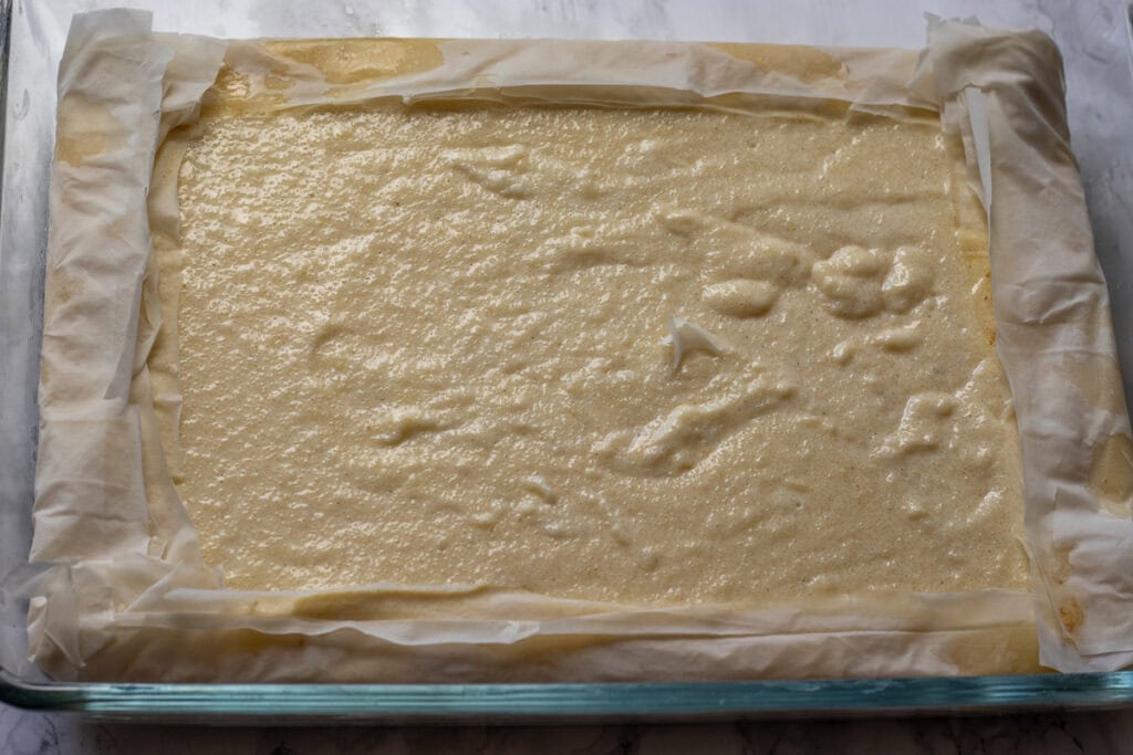 - Remove from the oven and pour the cool syrup slowly over the hot pastry.