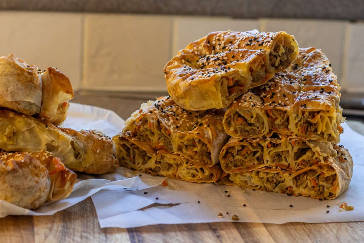 Kol Böreği, or Turkish Arm Borek, is a delicious savory pastry filled with a mixture of ground meat, onions, and spices. It is very easy to make with store-bought phyllo or yufka. It’s a recipe that brings a little bit of Turkish tradition to your kitchen without much fuss.