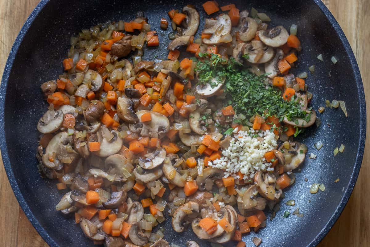 - Stir in the garlic, carrot, mushrooms and cook for another 2 to 3 minutes.